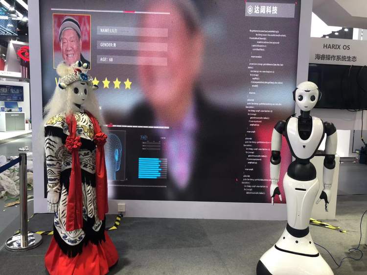 更多的时候,我们看到的是人与机器人互动,而在达闼机器人展台,可以看到机器人与机器人互动。展会期间,2个机器人将身穿京剧服饰,表演《大闹天宫》中的选段,来一场精彩的京剧对打戏。