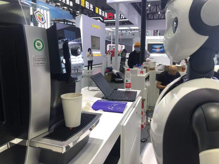 展台现场,还有一个会做咖啡的机器人,只要你跟它说,“来一杯咖啡”,它就会开始制作,完成之后将热腾腾的咖啡端到你面前。