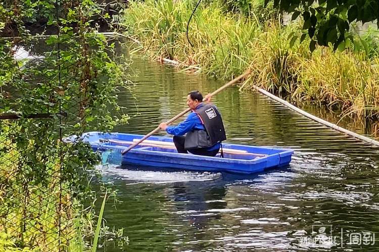 8月30日下午,虹口区相关部门接到“老叶较真”记者反馈的信息后,立即前往现场查看,并划着塑料小船在河浜上游弋,试图寻找这条“大鱼”的踪迹。