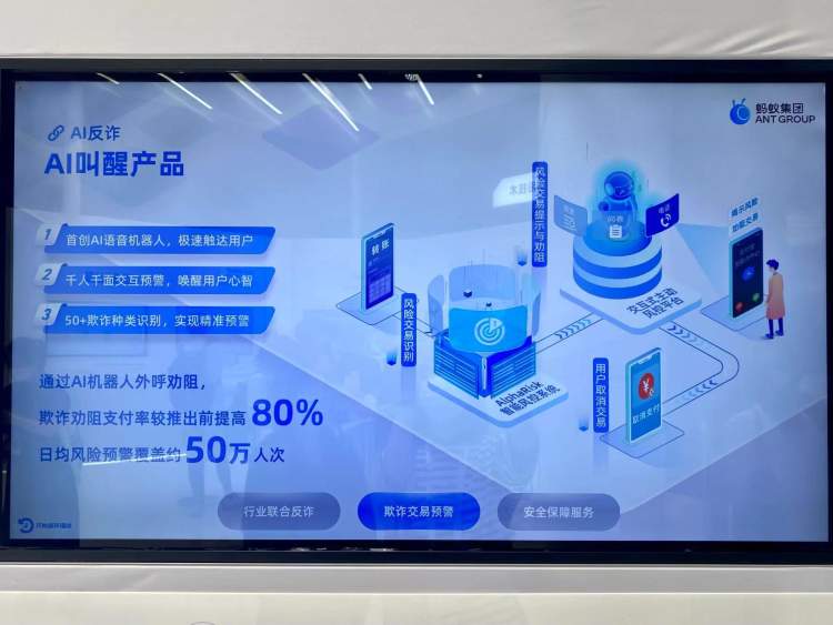 实际上,这套基于智能风险感知与响应联合系统的AI叫醒产品,并非首次亮相。但据蚂蚁集团展区工作人员介绍,与此前相比,现在的AI反诈功能有了进一步升级,在叫醒功能的基础上,增添了“转账冷静期”与“交易反悔期”。