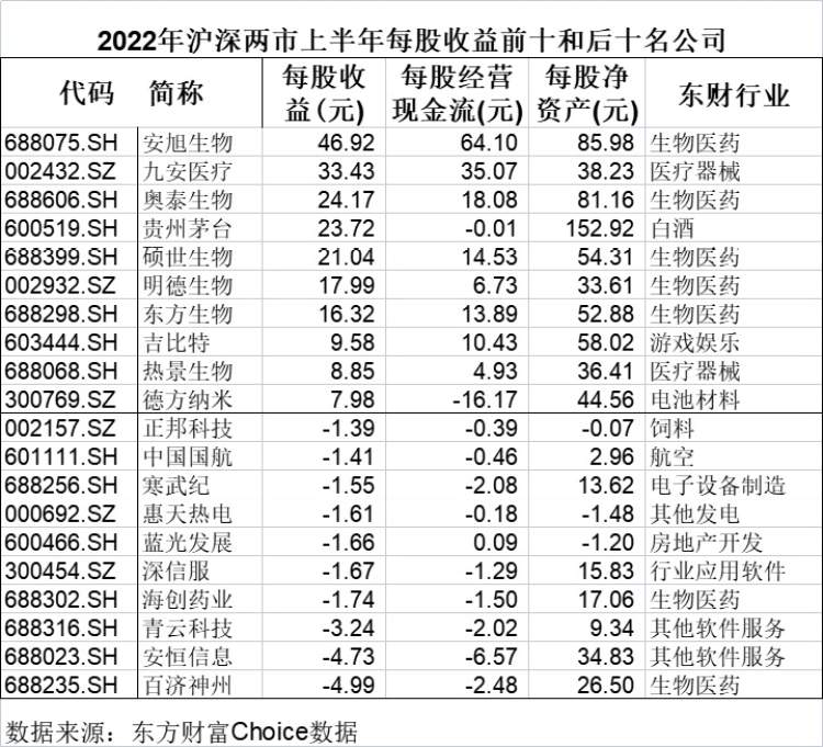 而银行股净利润绝对额依然领先,工商银行、建设银行、农业银行、中国银行上半年归母净利润均超过千亿元。其中工行以1715.06亿元居A股之首。从每股收益看,今年上半年安旭生物、九安医疗、奥泰生物、贵州茅台、硕世生物、明德生物和东方生物7家公司超过15元,A股“一哥”茅台每股收益23.72元仅居第四。