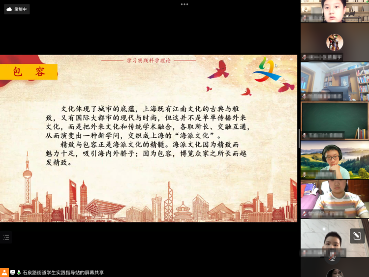 “海纳百川、追求卓越、开明睿智、大气谦和”是上海的城市精神,“开放、创新、包容”是上海最鲜明的品格。通过丰富的在线互动,带领同学们了解这座城市的奋进历程和累累硕果,感悟新时代美好生活和城市精神品格,修身立德,茁壮成长。