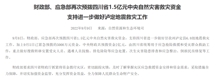 记者从财政部网站获悉,9月8日,财政部、应急部再次预拨四川省1.5亿元中央自然灾害救灾资金,支持四川省进一步做好甘孜州泸定县6.8级地震救灾工作。加上9月5日已紧急预拨的5000万元资金,中央财政共预拨资金2亿元,由四川省统筹用于应急抢险救援和受灾群众救助工作,重点做好搜救转移安置受灾人员、遇难人员抚恤、排危除险等应急处置、次生灾害隐患排查和应急整治、倒损民房修复等工作。