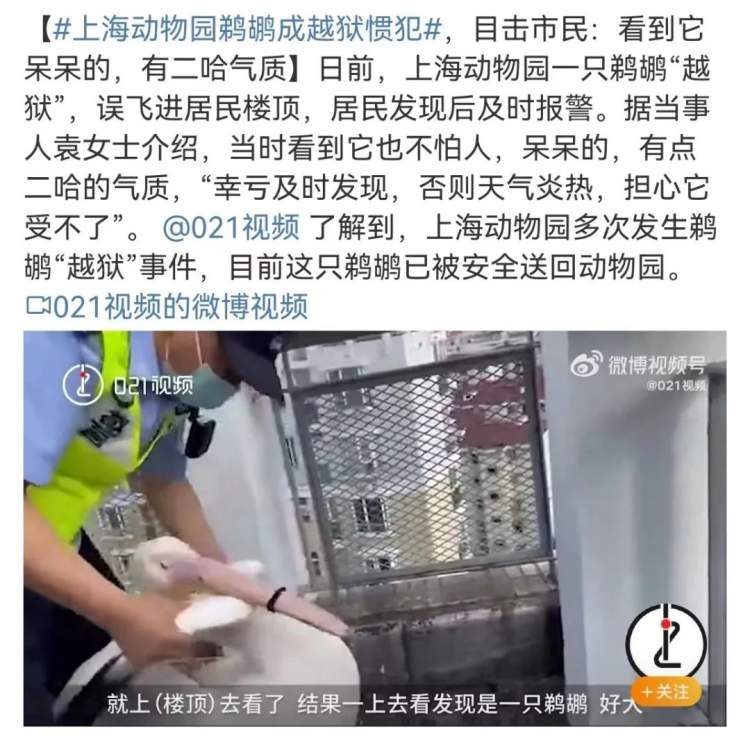 最近,就有一只鹈鹕飞到了居民楼顶,可能因为楼顶天台有较高护栏遮挡,不利于它起飞,所以飞不回来了。居民报警后,鹈鹕被相关部门送回动物园。几年前,鹈鹕也曾飞到虹桥机场附近的水塘。