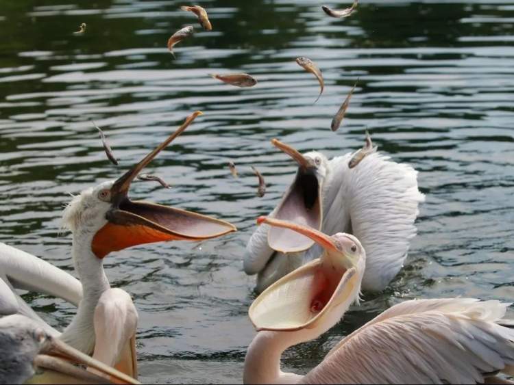 训练是这样展开的:每次给鹈鹕喂食前,主训饲养员先吹响哨声,鹈鹕是群居动物,只要有一只飞过来,那就会全体跟着过来。