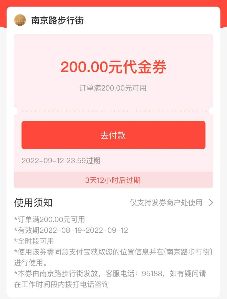 友情提醒一下,如果你曾经在8月18日上午抢到南京路步行街发放的首轮消费券(分为“300元团600元”和“100元团200元”两种),这个中秋假期可就是用券的最后时间了哦~如图所示,有效期截至9月12日——