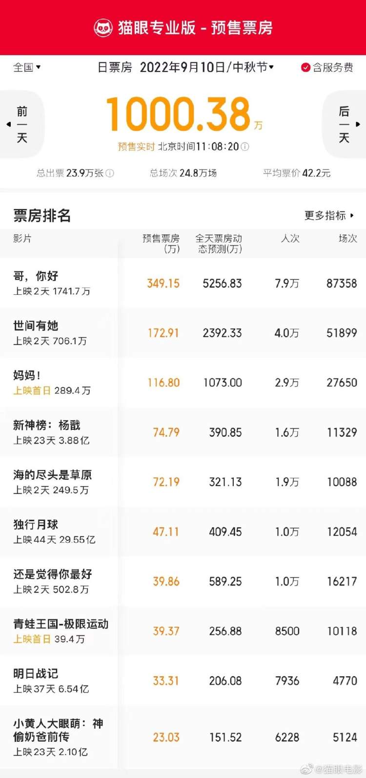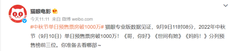 猫眼:中秋节单日预售票房破1000万,《妈妈!》位列预售榜前三 周到君 2022-9-09 来源:周到上海 周到君从 @猫眼电影 了解到 ,9月9日11时08分,2022年中秋节(9月10日)单日预售票房破1000万! 《哥,你好》《世间有她》《妈妈!》分列预售榜前三位。 你准备去看哪部~ 来源:周到上海 作者:周到君 赞一个 (0)