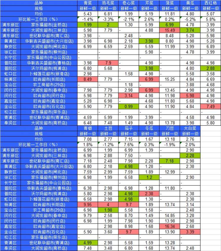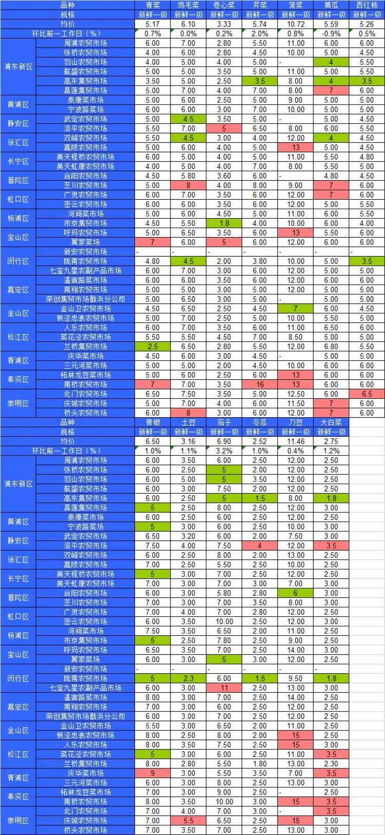 ■粉底标注代表该蔬菜品种在上述农贸市场或超市的最高价;绿底标注代表该蔬菜品种在上述农贸市场或超市的最低价