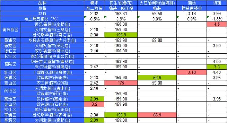 ■粉底标注代表该粮油品种在上述超市的最高价;绿底标注代表该粮油品种在上述超市的最低价