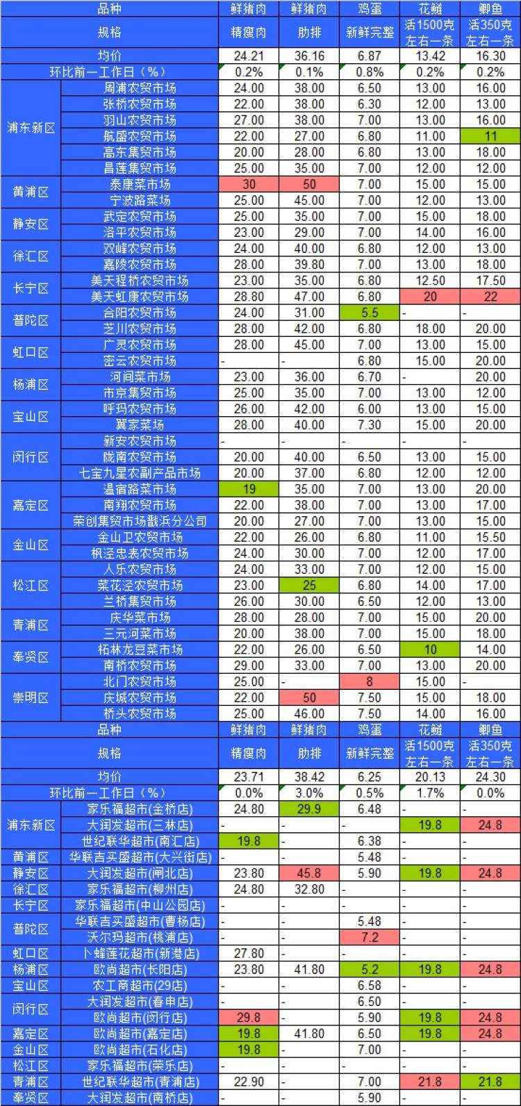 ■粉底标注代表该肉蛋鱼品种在上述农贸市场或超市的最高价;绿底标注代表该肉蛋鱼品种在上述农贸市场或超市的最低价