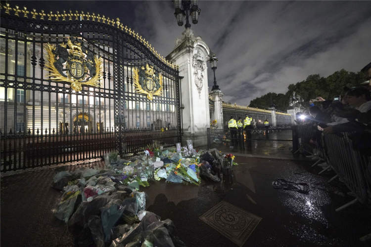 9月8日傍晚,王室工作人员在白金汉宫门前的栏杆上悬挂了讣告。在白金汉宫门前广场,人们在引导下前往白金汉宫门前瞻仰,不断有人将手中的鲜花插在栏杆上。这些花束将被允许摆放12个小时,随后被转移到绿园中的指定区域。