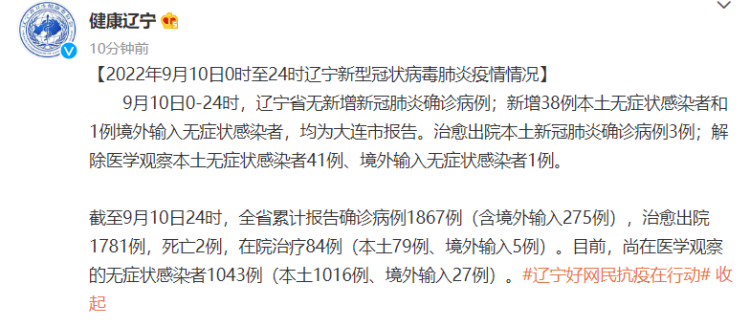 据@健康辽宁 消息,9月10日0-24时,辽宁省无新增新冠肺炎确诊病例;新增38例本土无症状感染者和1例境外输入无症状感染者,均为大连市报告。治愈出院本土新冠肺炎确诊病例3例;解除医学观察本土无症状感染者41例、境外输入无症状感染者1例。