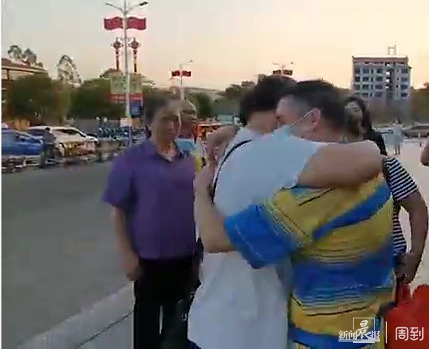 9月6日中秋节前夕,沐浴着绚烂晚霞的广西全州南站外,三人紧紧地抱在一起,他们是走失31年的聋哑人小龙和他的家人们。