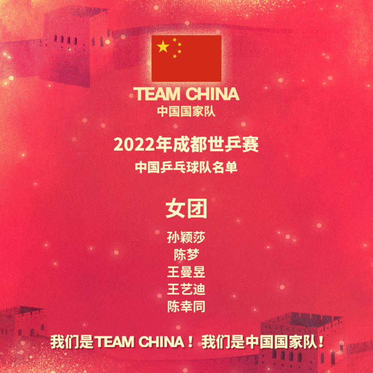 国乒成都世乒赛名单确定!看看男团女团都有谁→ 杨婷婷 2022-9-11 来源:周到上海 记者从@TEAMCHINA中国国家队 获悉,2022年成都世乒赛团体赛中国队参赛名单正式公布。 具体名单如下: 女团名单包括孙颖莎、陈梦、王曼昱、王艺迪、陈幸同。 男团名单包括樊振东、马龙、梁靖崑、王楚钦、林高远。 据悉,成都世乒赛团体赛将于9月30日至10月9日举行。 为热爱,为荣誉,为祖国,再出发!为他们加油! 来源:周到上海 作者:杨婷婷 赞一个 (0)