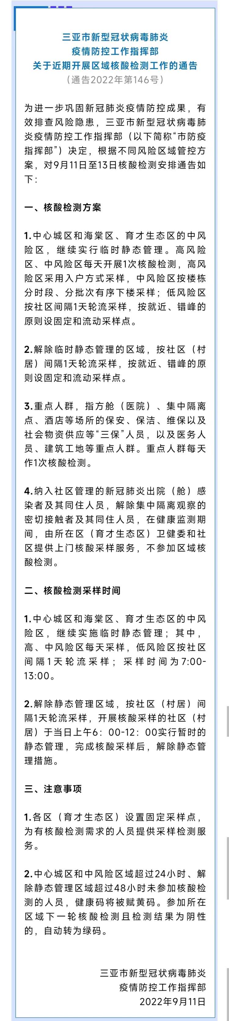 三亚市新型冠状病毒肺炎疫情防控工作指挥部决定,根据不同风险区域管控方案,对9月11日至13日核酸检测安排通告如下: