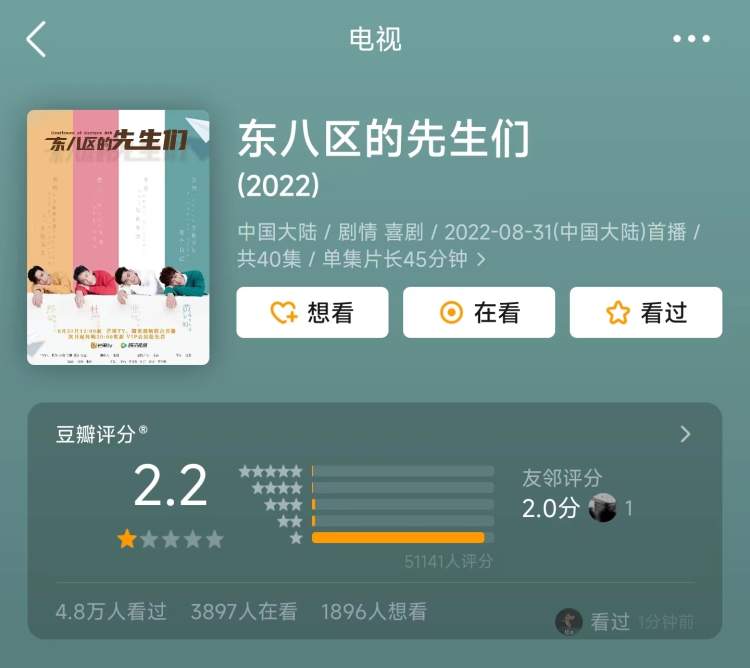 《东八区的先生们》的定位是“都市生活轻喜剧”,号称“男版三十而已”和“芒果台王炸”。然而,开播以来观众的整体评价就是油腻、悬浮,评分更有可能创造豆瓣的低分记录——目前,豆瓣历史上的最低分是《逐梦演艺圈》的2.1分,《东八区的先生们》已经降到了2.2分,超过90%的观众打出了1星的评价。