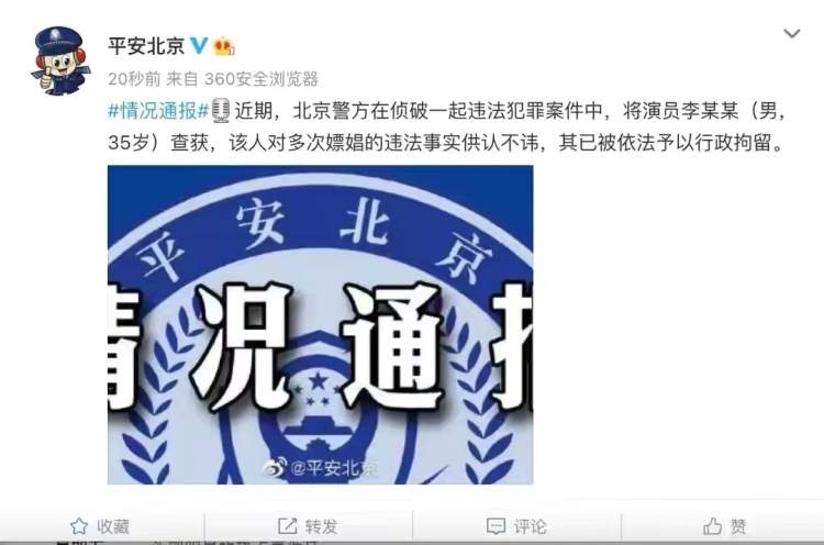 北京警方通报:演员李某某多次嫖娼已被依法行政拘留 曾索狄 2022-9-11 来源:周到上海 9月11日,北京警方发布通告称,近期,北京警方在侦破一起违法犯罪案件中,将演员李某某(男,35岁)查获,该人对多次嫖娼的违法事实供认不讳,其已被依法予以行政拘留。随后媒体求证发现,李某某,就是演员李易峰。 来源:周到上海 作者:曾索狄 赞一个 (0)