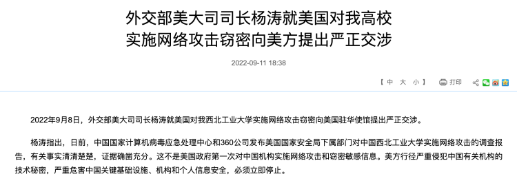 外交部网站9月11日消息,2022年9月8日,外交部美大司司长杨涛就美国对我西北工业大学实施网络攻击窃密向美国驻华使馆提出严正交涉。