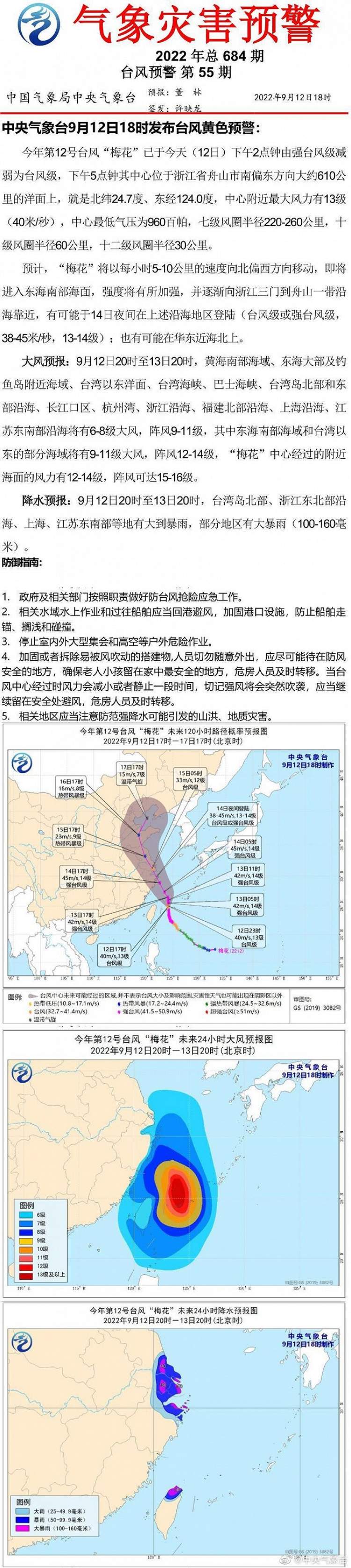 中央气象台9月12日18时发布台风黄色预警:今年第12号台风“梅花”已于今天(12日)下午2点钟由强台风级减弱为台风级,下午5点钟其中心位于浙江省舟山市南偏东方向大约610公里的洋面上,就是北纬24.7度、东经124.0度,中心附近最大风力有13级(40米/秒),中心最低气压为960百帕,七级风圈半径220-260公里,十级风圈半径60公里,十二级风圈半径30公里。