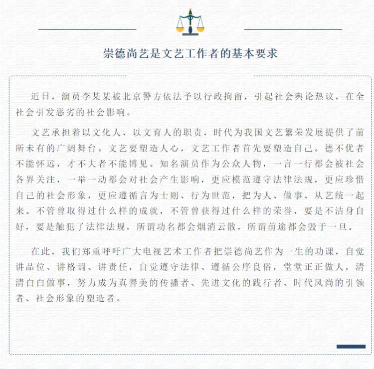 文艺承担着以文化人、以文育人的职责,时代为我国文艺繁荣发展提供了前所未有的广阔舞台。文艺要塑造人心,文艺工作者首先要塑造自己。德不优者不能怀远,才不大者不能博见。知名演员作为公众人物,一言一行都会被社会各界关注,一举一动都会对社会产生影响,更应模范遵守法律法规,更应珍惜自己的社会形象,更应遵循言为士则、行为世范,把为人、做事、从艺统一起来。不管曾取得过什么样的成就,不管曾获得过什么样的荣誉,要是不洁身自好,要是触犯了法律法规,所谓功名都会烟消云散,所谓前途都会毁于一旦。