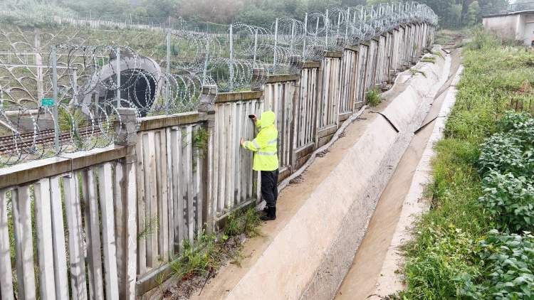 铁路工作人员在检查沿线防汛防台安全措施。