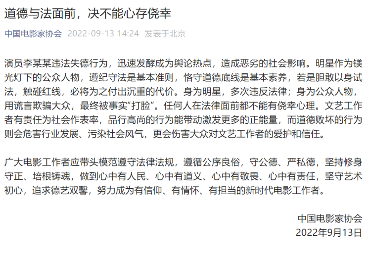 9月13日,中国电影家协会发文称,演员李某某违法失德行为,迅速发酵成为舆论热点,造成恶劣的社会影响。明星作为镁光灯下的公众人物,遵纪守法是基本准则,恪守道德底线是基本素养,若是胆敢以身试法,触碰红线,必将为之付出沉重的代价。身为明星,多次违反法律;身为公众人物,用谎言欺骗大众,最终被事实“打脸”。任何人在法律面前都不能有侥幸心理。文艺工作者有责任为社会作表率,品行高尚的行为能带动激发更多的正能量,而道德败坏的行为则会危害行业发展、污染社会风气,更会伤害大众对文艺工作者的爱护和信任。