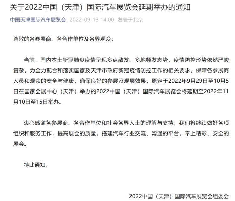天津国际车展官宣延期至11月10日至15日举办 周到君 2022-9-13 来源:周到上海 9月13日,2022中国(天津)国际汽车展览会组委会发布通知:为全力配合和落实国家及天津市政府新冠疫情防控工作的相关要求,保障各参展商人员和观众的安全与健康,确保良好的参展及观展效果,原定于2022年9月29日至10月5日在国家会展中心(天津)举办的2022中国(天津)国际汽车展览会将延期至2022年11月10日至15日举办。 来源:周到上海 作者:周到君 赞一个 (0)