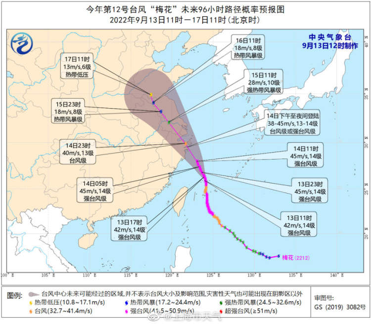 预计,“梅花”将以每小时10公里左右的速度向北偏西方向缓慢移动,强度缓慢增强,并将于14日下午到夜间在浙江温岭到舟山一带沿海登陆,登陆后“梅花”将继续向西北方向移动,强度逐渐减弱。