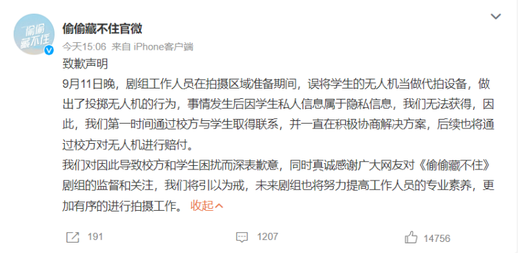 声明称,9月11日晚,剧组工作人员在拍摄区域准备期间,误将学生的无人机当做代拍设备,做出了投掷无人机的行为,事情发生后因学生私人信息属于隐私信息,我们无法获得,因此,我们第一时间通过校方与学生取得联系,并一直在积极协商解决方案,后续也将通过校方对无人机进行赔付。