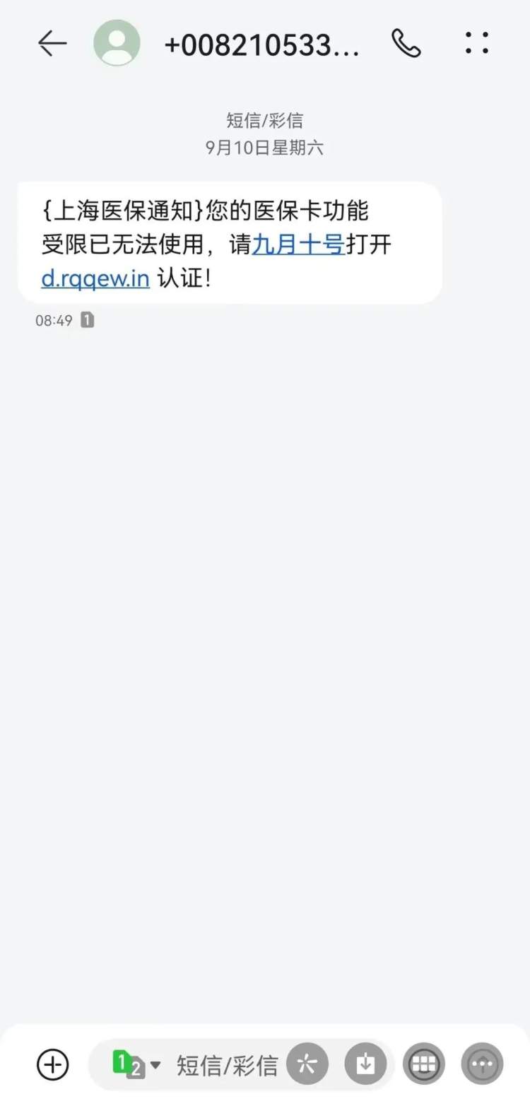 重要提醒,此短信非医保部门发送!或涉及欺诈,请勿点击短信内容中的网站链接 谢克伟 2022-9-13 来源:周到上海 近日有市民向医保部门反映,收到一条“〔上海医保通知〕医保卡功能受限已无法使用”的短信,并要求打开一个网站更新医保信息并恢复使用(如下图)。 为此医保部门提醒市民,此短信非医保部门发送,该短信有可能涉及欺诈,请勿点击短信内容中的网站链接。 如您对医保账户有任何疑问可拨打12393医保咨询电话进行咨询。 来源:周到上海 作者:谢克伟 赞一个 (0)