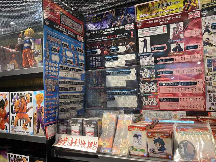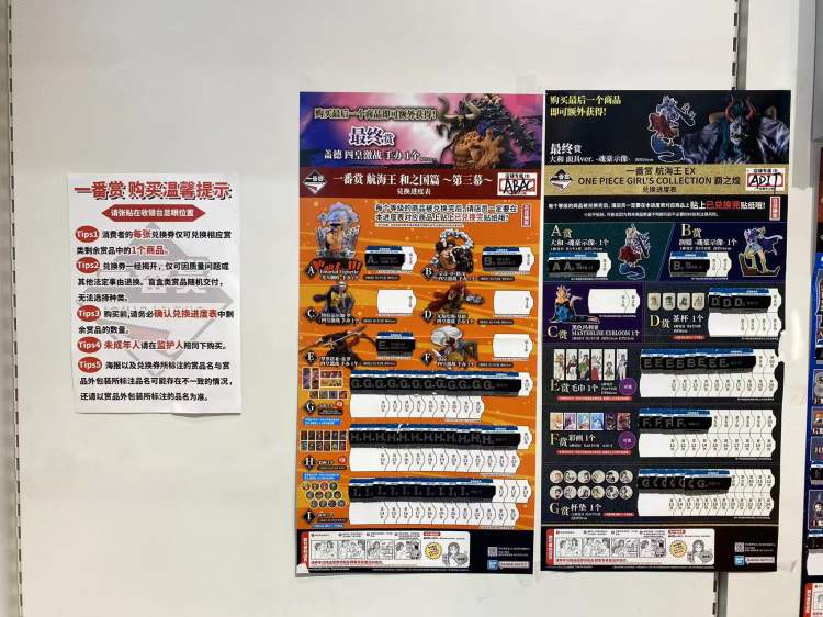 在协信星光广场内的潮悦色,推出的“一番赏”产品,店内也对这个产品的销售规则进行了一番介绍:先在商家处付款后——从兑换券箱中任意抽取一张兑换券——交店员换取对应等级的商品——店铺内会张贴对应每盒奖品兑换情况的进度表——抽走每盒最后一张兑换券的,可额外获得超级稀有的“最终赏”一个。