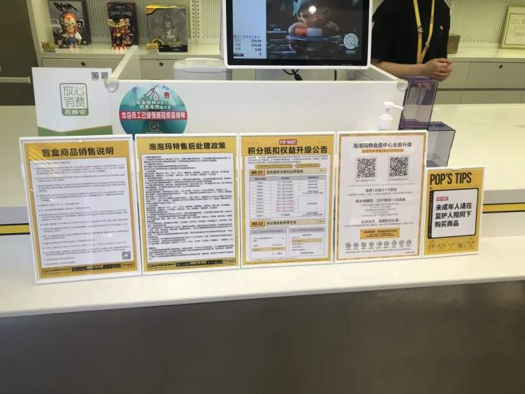 在五角场合生汇以及静安大悦城的POP MART实体店记者看到,在店内显著位置均公示了抽取规则,店内关于商品和服务的说明小海报排列整齐,摆放在明显的位置,各类信息比较完善及全面。但对于隐藏款的抽取概率,也没有明确公示,需要询问店员才能了解。