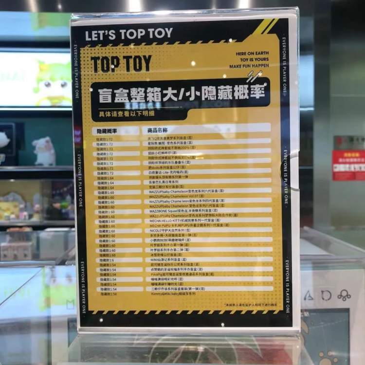 做的较好的是大宁商业广场内的TOP TOY全球潮玩集合店,这家店铺在盲盒区域的明显位置,非常清楚的以海报形式公布了各类商品的抽取概率、方法等关键信息。