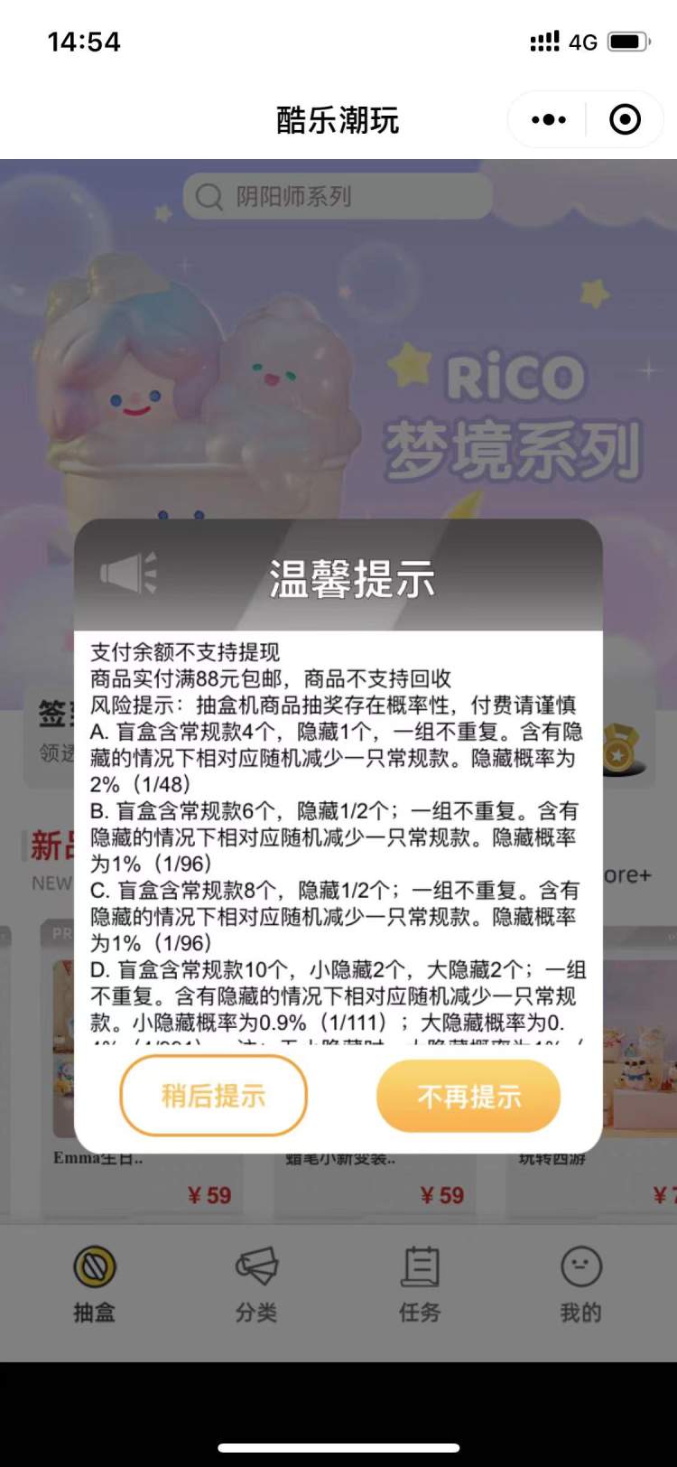 不过,在两家酷乐潮玩店的盲盒商品展示区域,除了商品销售说明外,记者并未看到有“未成年人请在监护人陪同下购买商品”的相关提示。