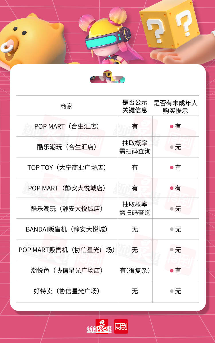 然而,记者走访本市4家商场9家盲盒经营主体测评发现,新规实施以来,尽管一些商家公示了相关抽取规则,但对隐藏款抽取概率等关键信息设置了障碍,对未成年人购买提醒也有缺失,尤其是无人贩售机问题较为严重。