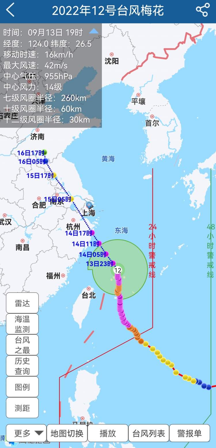 今年第12号台风“梅花”,今天17时位于距离上海浦东南汇嘴东南约545公里的海面上(北纬26.3度、东经124.0度),中心附近最大风力有14级(42米/秒),中心最低气压为955百帕,强度维持强台风级。