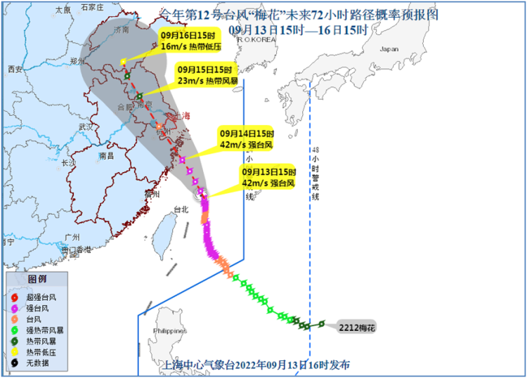 中央气象台预计,“梅花”将以每小时10~15公里的速度向偏北转西北方向移动,逐渐向浙江温岭到舟山一带沿海靠近,并将于14日下午到夜间在上述沿海地区登陆(台风级或强台风级)。登陆后,“梅花”将继续向西北方向移动,强度逐渐减弱。