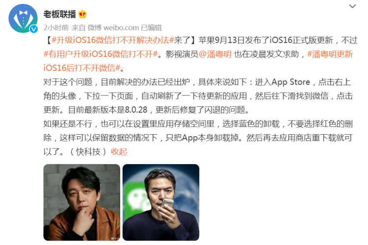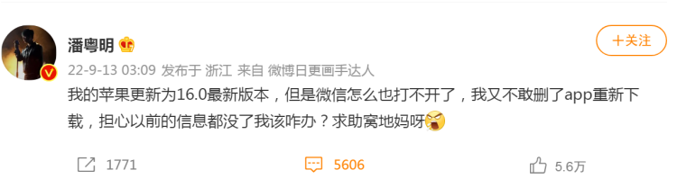 13日凌晨,演员潘粤明也在微博发文称,自己的手机更新到16.0后,无法打开微信: