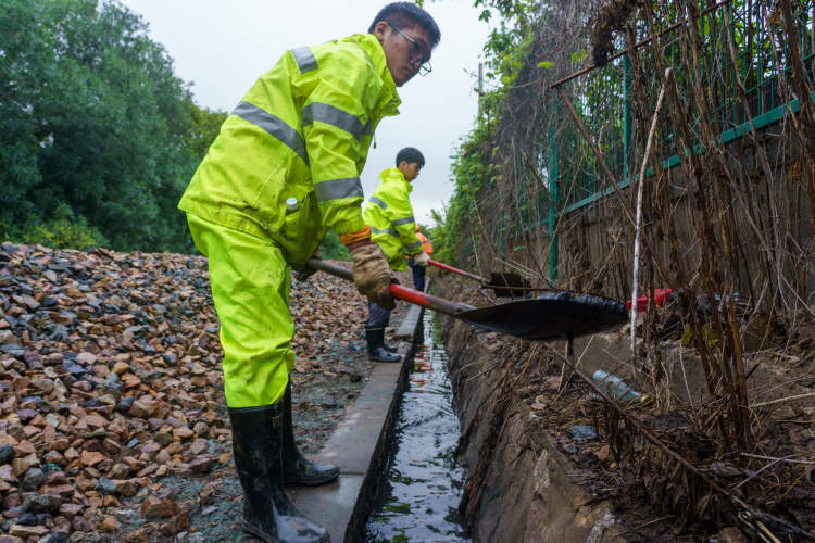 上海工务段何家湾线路工区工作人员清理排水沟