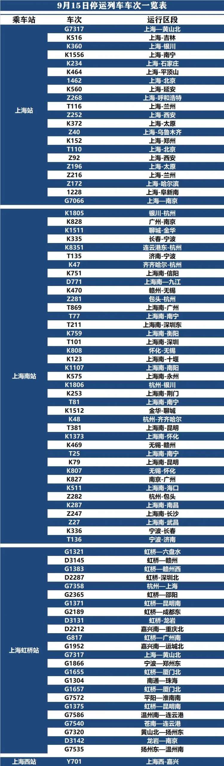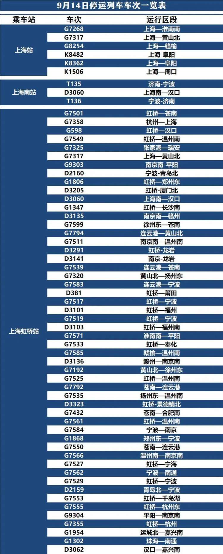 受台风“梅花”影响,截至9月14日上午11时,铁路上海站(下辖上海站、上海南站、上海虹桥站、上海西站、安亭北站、南翔北站、安亭西站)部分列车停运,具体车次见下表。