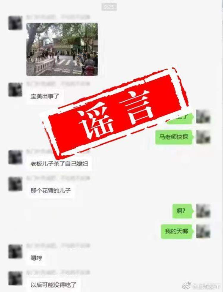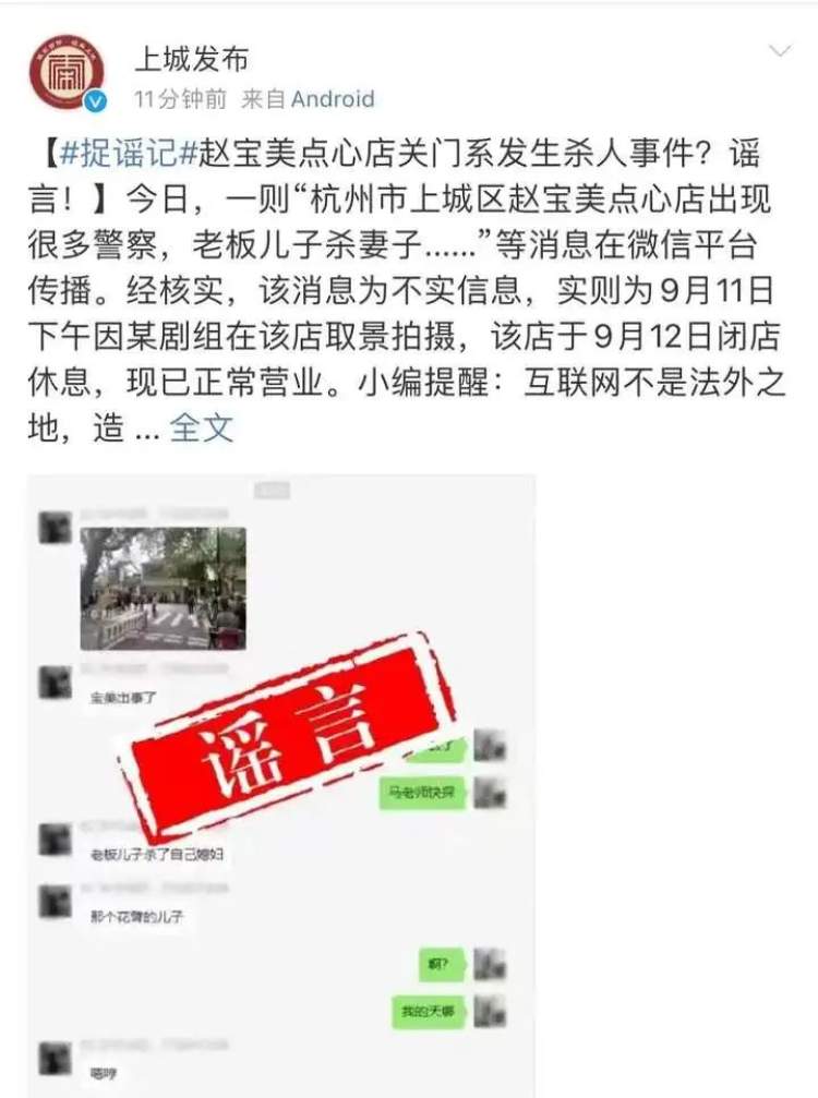 杭州赵宝美点心店发生命案?官方:不实! 周到君 2022-9-14 来源:周到上海 据杭州上城区政府新闻办公室官方微博通报,今日,一则“杭州市上城区赵宝美点心店出现很多警察,老板儿子杀妻子……”等消息在微信平台传播。 经核实,该消息为不实信息,实则为9月11日下午因某剧组在该店取景拍摄,该店于9月12日闭店休息,现已正常营业。 小编提醒:互联网不是法外之地,造谣传谣行为不仅违反互联网有关规定,还会构成违法犯罪,希望广大网民自觉做到不造谣、不传谣、不信谣。 来源:周到上海 作者:周到君 赞一个 (0)