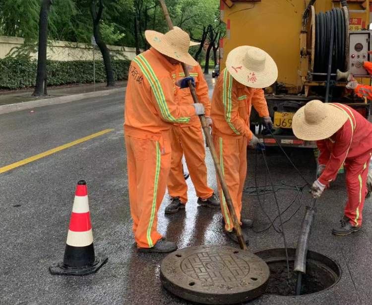 ▲市政养护单位赶在台风登陆前疏通管井,目前金山主城区90多个排放口已经处理完毕。