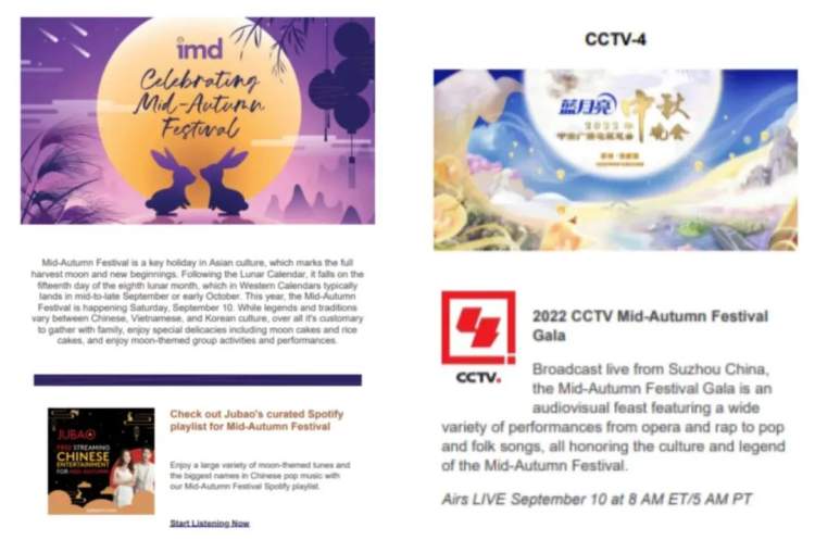秋晚播出当天,总台CGTN推出法语和西班牙语中秋特别直播节目,邀请探班总台秋晚的主持人做客直播间,向海外观众介绍中秋习俗及寓意,探秘总台秋晚的幕后点滴,展示江苏非物质文化遗产及江南文化魅力。