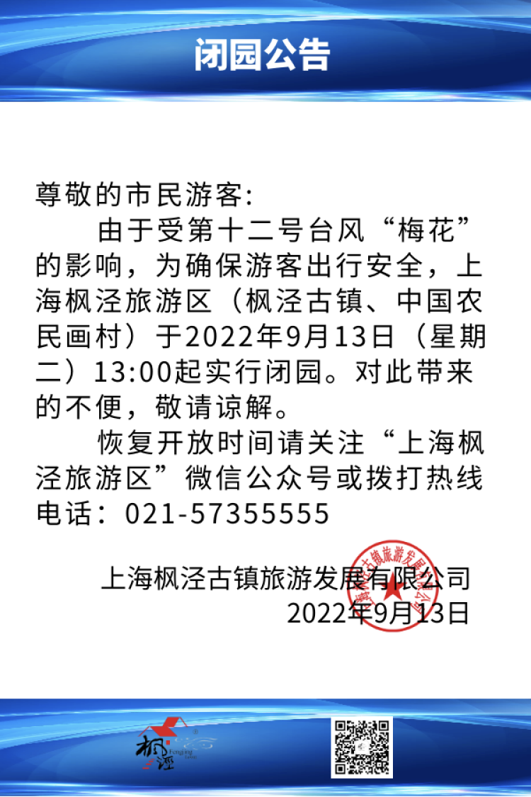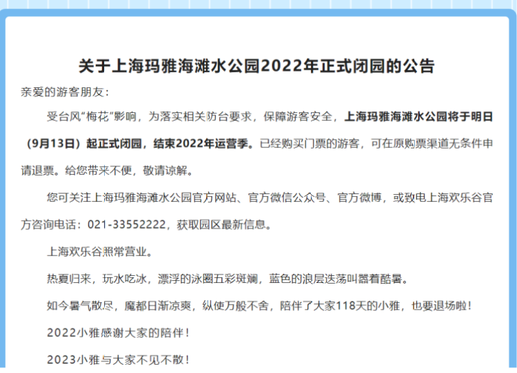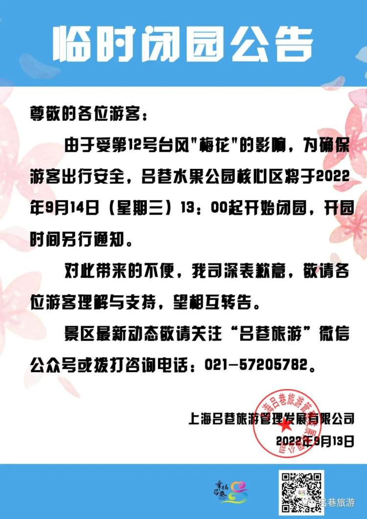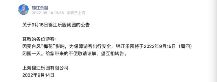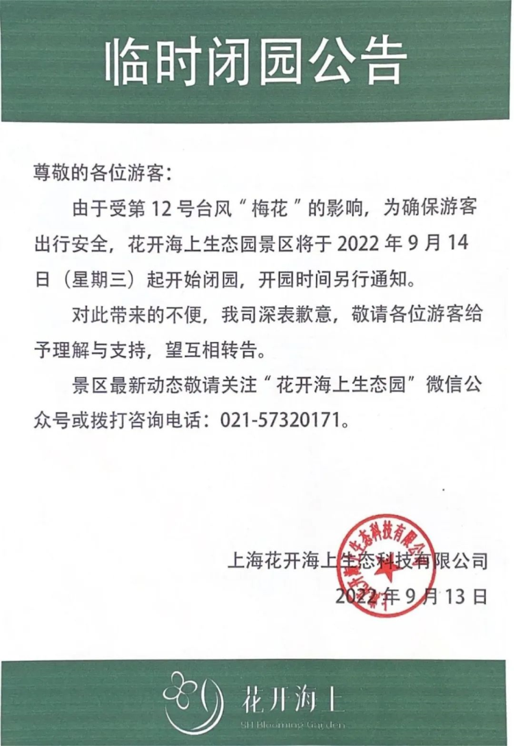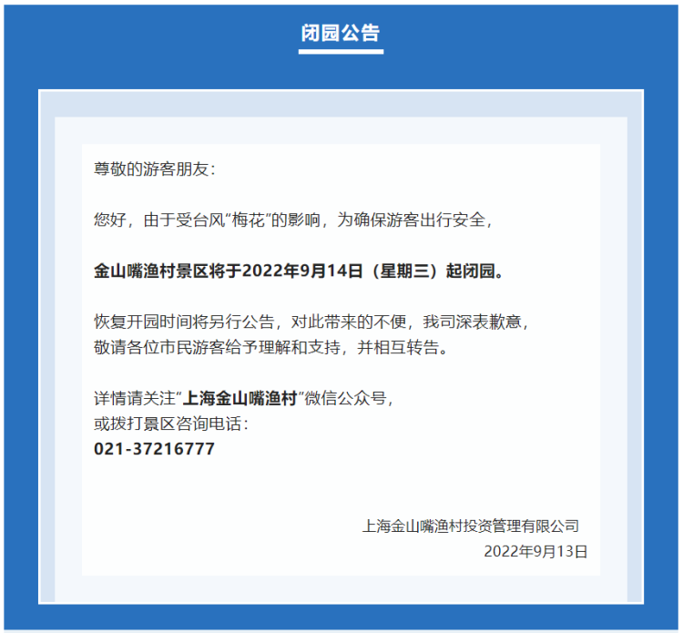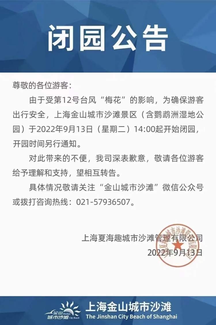 台风“梅花”来袭,上海天文馆、锦江乐园、城市沙滩等多个景区临时闭园! 李晓明 沙情奕 2022-9-14 来源:周到上海 受第12号台风“梅花”的影响,为确保游客出行安全,上海多个景点宣布临时闭园。 记者获悉,包括上海天文馆、上海锦江乐园、上海金山城市沙滩、金山嘴渔村等多个景区已经发布了闭园公告。上海玛雅海滩水公园宣布提前结束2022年运营季。 上海天文馆: 上海锦江乐园: 金山城市沙滩: 金山嘴渔村: 花开海上生态园: 枫泾旅游区: 吕巷水果公园: 上海玛雅水公园: 碧海金沙景区: 来源:周到上海 作者:李晓明 沙情奕 赞一个 (0)
