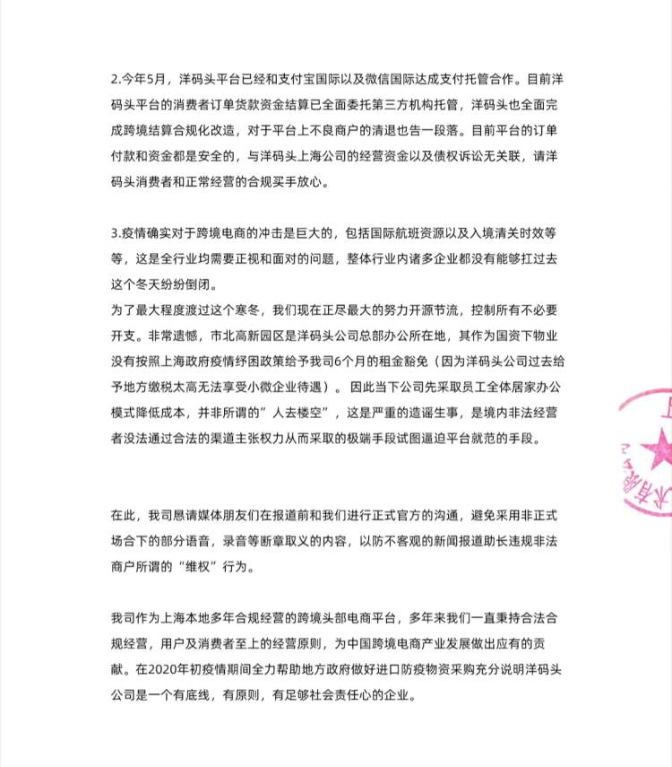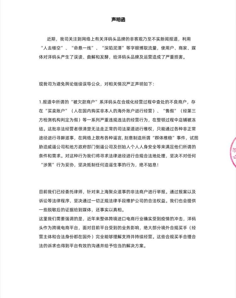 在官方声明中,洋码头表示,报道中所谓的“被欠款商户”系洋码头在合规化经营过程中查处的不良商户,存在“买卖账户”(人在国内购买非本人的海外账户进行经营)、“售假”(经第三方检测机构判定为假)等一系列严重违规违法的经营行为,在整顿过程中店铺被冻结。这批非法经营者很清楚无法走正常的司法渠道进行维权,只能通过各种非正常途径进行寻衅滋事,在网络上散布各种谣言,刻意制造所谓“群体维稳”事件,试图胁迫威逼公司和地方政府部门倒逼公司及创始人个人人身安全等来满足他们所谓的条件和需求。