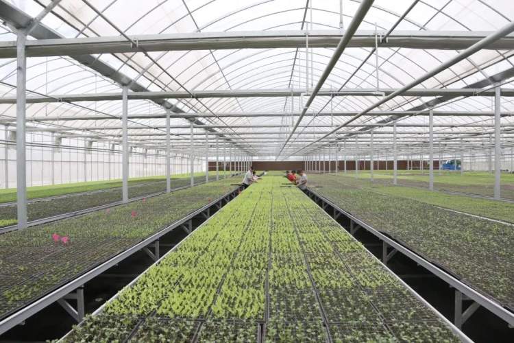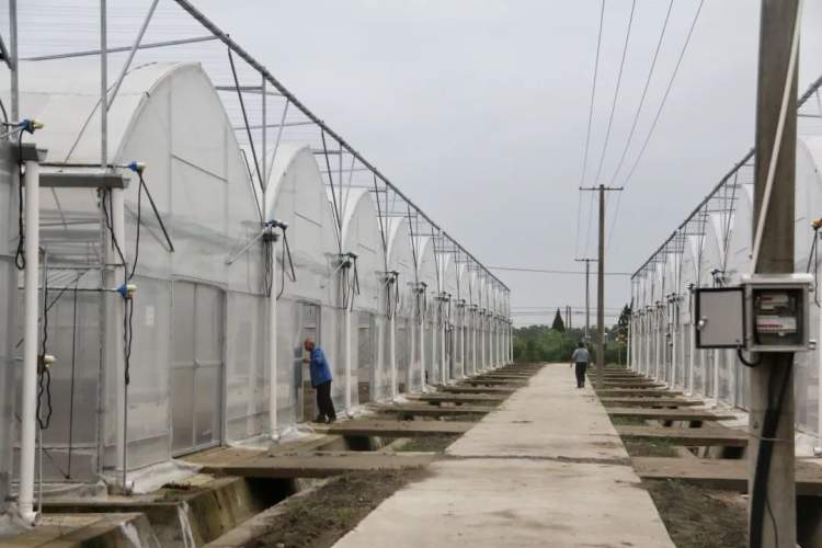 在基地负责人欧涛的指挥下,工人们逐一关闭连栋大棚的天窗、大门,将大棚两侧通风口的摇杆降下,最后关上所有通风口,防止风雨天气对农作物的侵害。