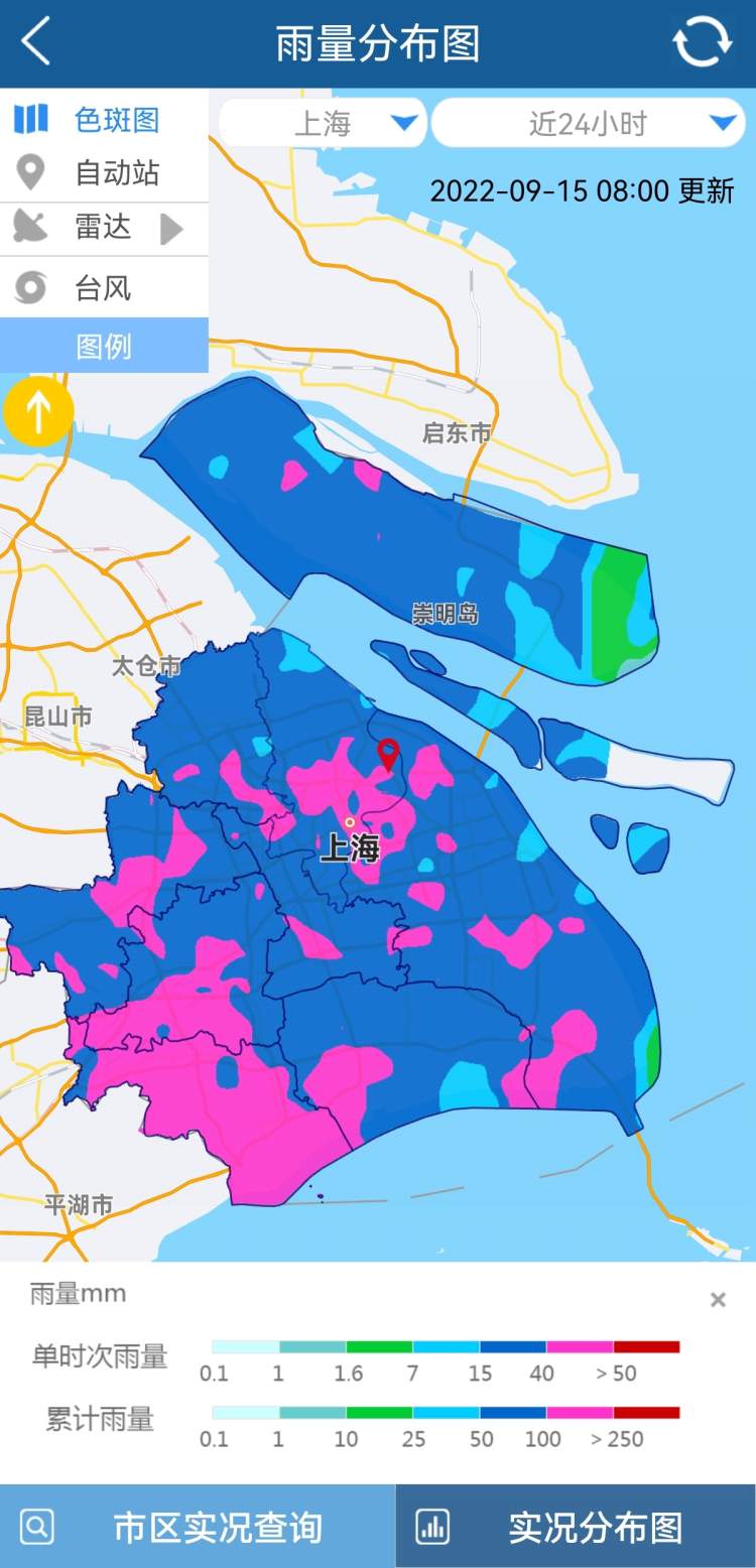 14日7时-15日6时,全市731个测站中,345个达到大暴雨程度,363个达到暴雨程度,18个达到大雨程度。降雨主要分布在普陀区、金山区、松江区等,其中雨量最大为普陀区岚皋南(污)站171.3毫米,最大小时雨量是金山廊下镇站,降雨量47.5毫米(14日22:10-23:10)。