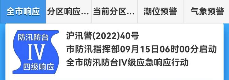 全市于15日6时更新防汛防台Ⅳ级响应行动,崇明、宝山、浦东三区维持防汛防台Ⅲ级响应行动。