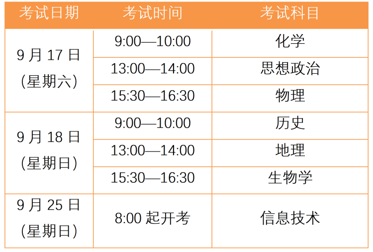 常规考点9月17日下午连续参加思想政治和物理科目考试的考生,以及9月18日下午连续参加地理和生物学科目考试的考生,须特别注意在两场考试候考期间不能离开考点。考点设有专门的候考区域供考生休息候考。请考生在考点工作人员的指引下,在候考室间隔就坐,保持安全距离,全程佩戴口罩,有序候考。候考期间,请考生特别注意考试时间和考场所在教室,严格按照规定时间、地点参加考试,切勿走错考场。