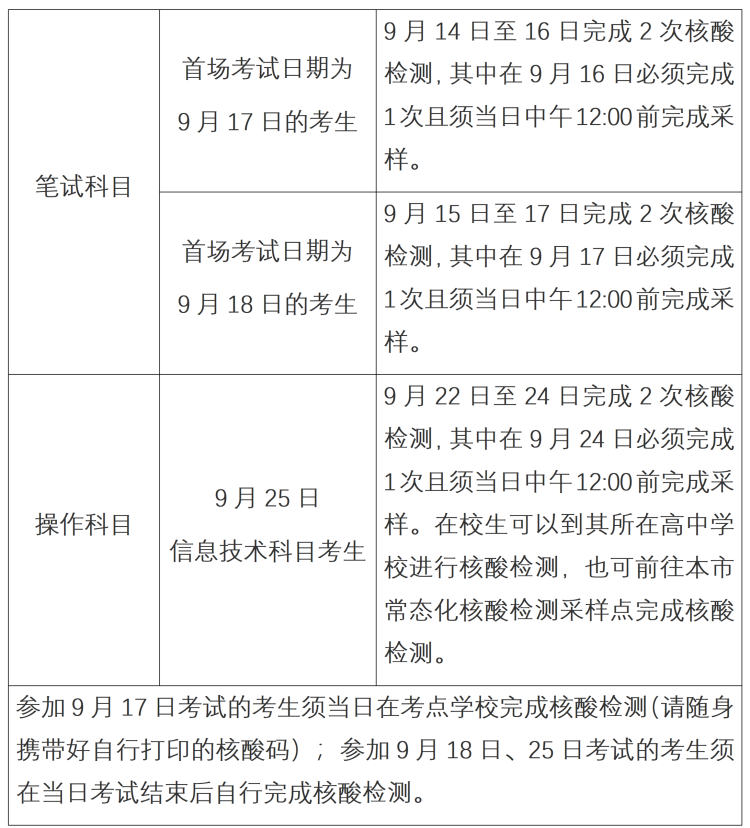 考试当天,考生须在出发前往考点前完成1次抗原检测。如有异常第一时间向所在学校或区招考机构报告。